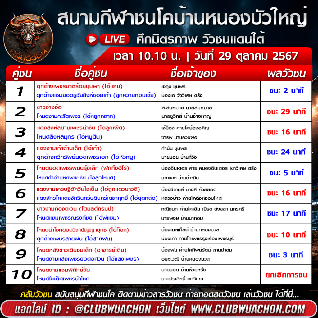 ผลวัวชน สนามกีฬาชนโคบ้านหนองบัวใหญ่ วันที่ 29 ตุลาคม 2567