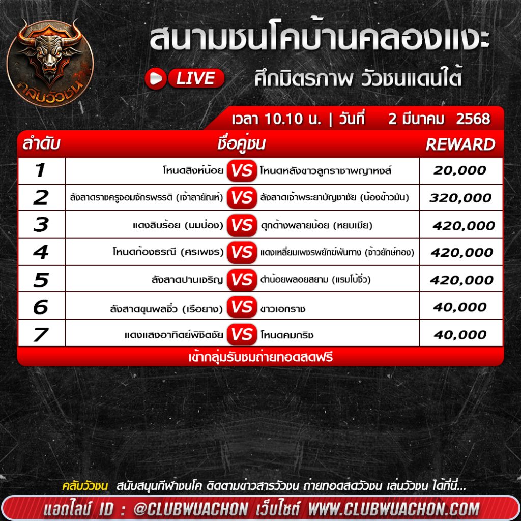 โปรแกรมวัวชน วันที่ 2 มีนาคม สนามชนโคบ้านคลองแงะ เริ่มชนเวลา 10.30 น.
