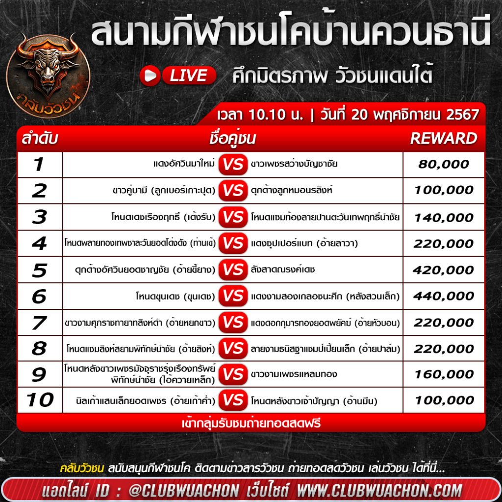 โปรแกรมวัวชน วันที่ 20 พฤศจิกายน 2567 สนามกีฬาชนโคบ้านควนธานี เริ่มชนเวลา 10:30 น.